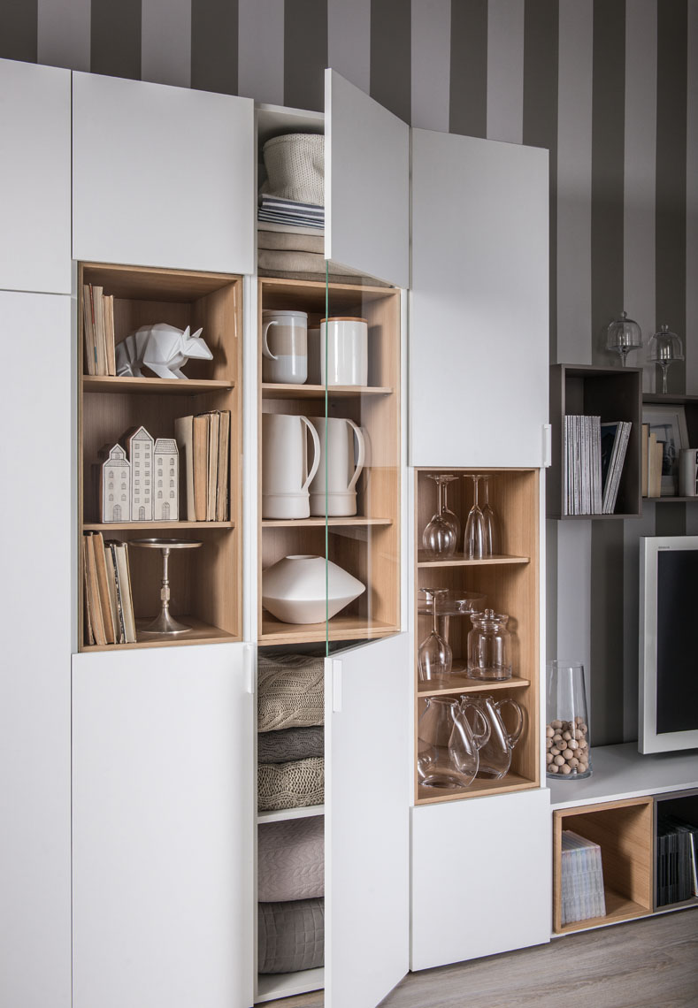 - Вітрина складається з корпусу, контрастного виїмки і двох шаф. Маленький вгорі і великий внизу - або навпаки! Залежно від ваших потреб ви можете розмістити шафи, де завгодно, під час складання меблів.
